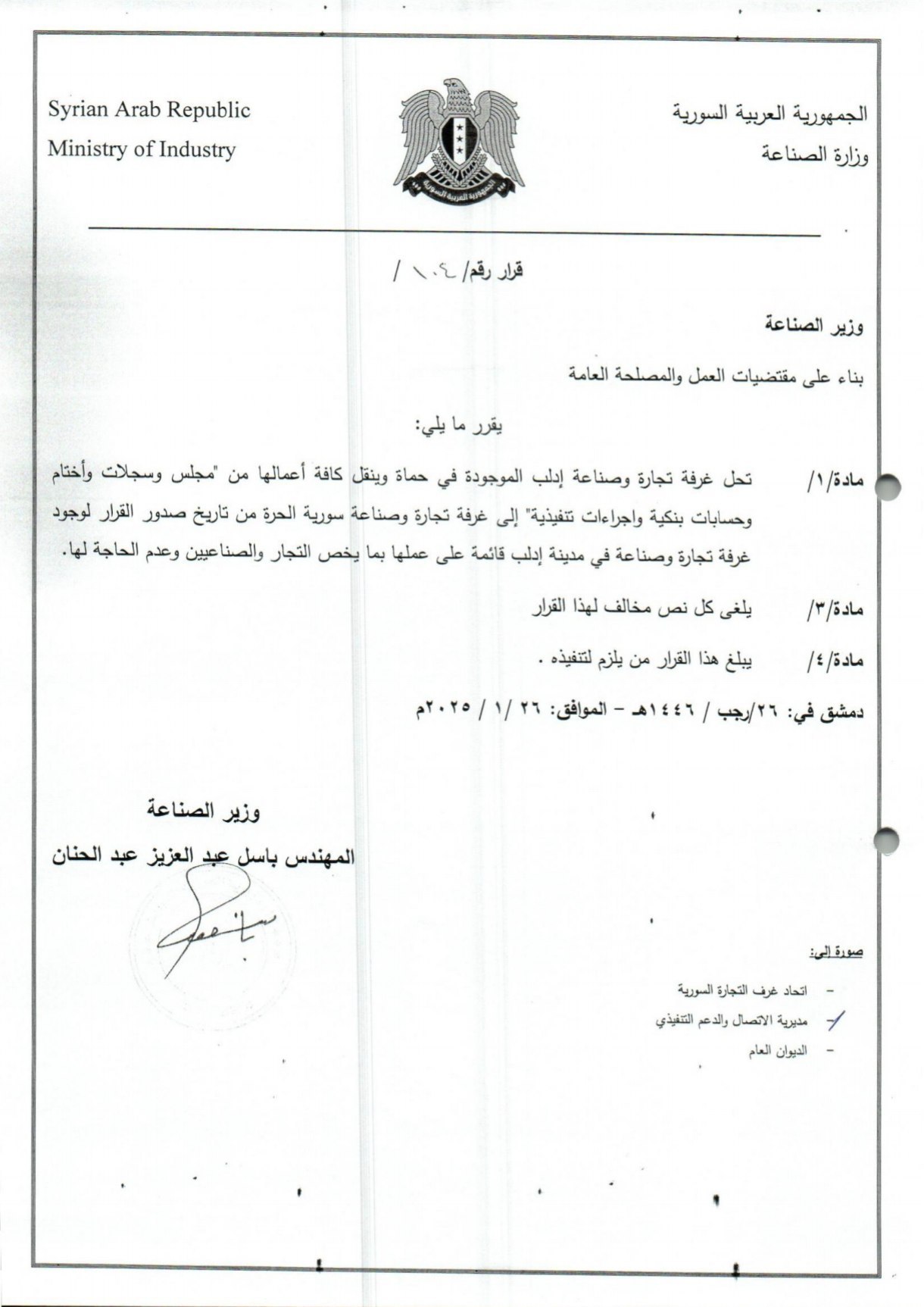 تحل غرفة تجارة وصناعة إدلب الموجودة في حماة وينقل كافة أعمالها من مجلس وسجلات وأختام وحسابات بنكية واجراءات تنفيذية إلى غرفة تجارة وصناعة سورية الحرة من تاريخ صدور القرار لوجود غرفة تجارة وصناعة في مدينة إدلب قائمة على عملها بما يخص التجار والصناعيين وعدم الحاجة لها.