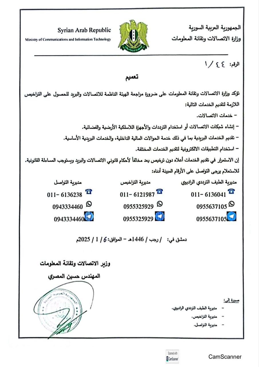 تؤكد وزارة الاتصالات وتقانة المعلومات على ضرورة مراجعة الهيئة الناظمة للاتصالات والبريد للحصول على التراخيص