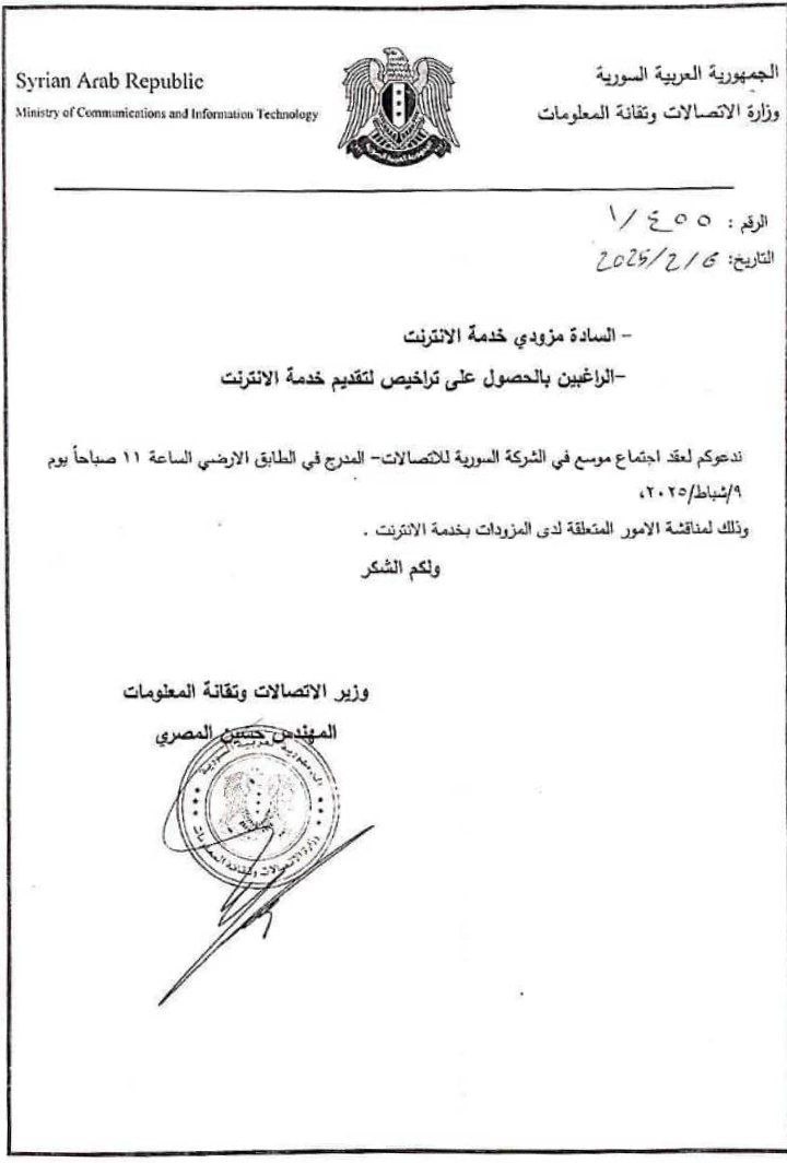 وزارة الاتصالات السورية تدعو مزودي خدمة الإنترنت لاجتماع موسع