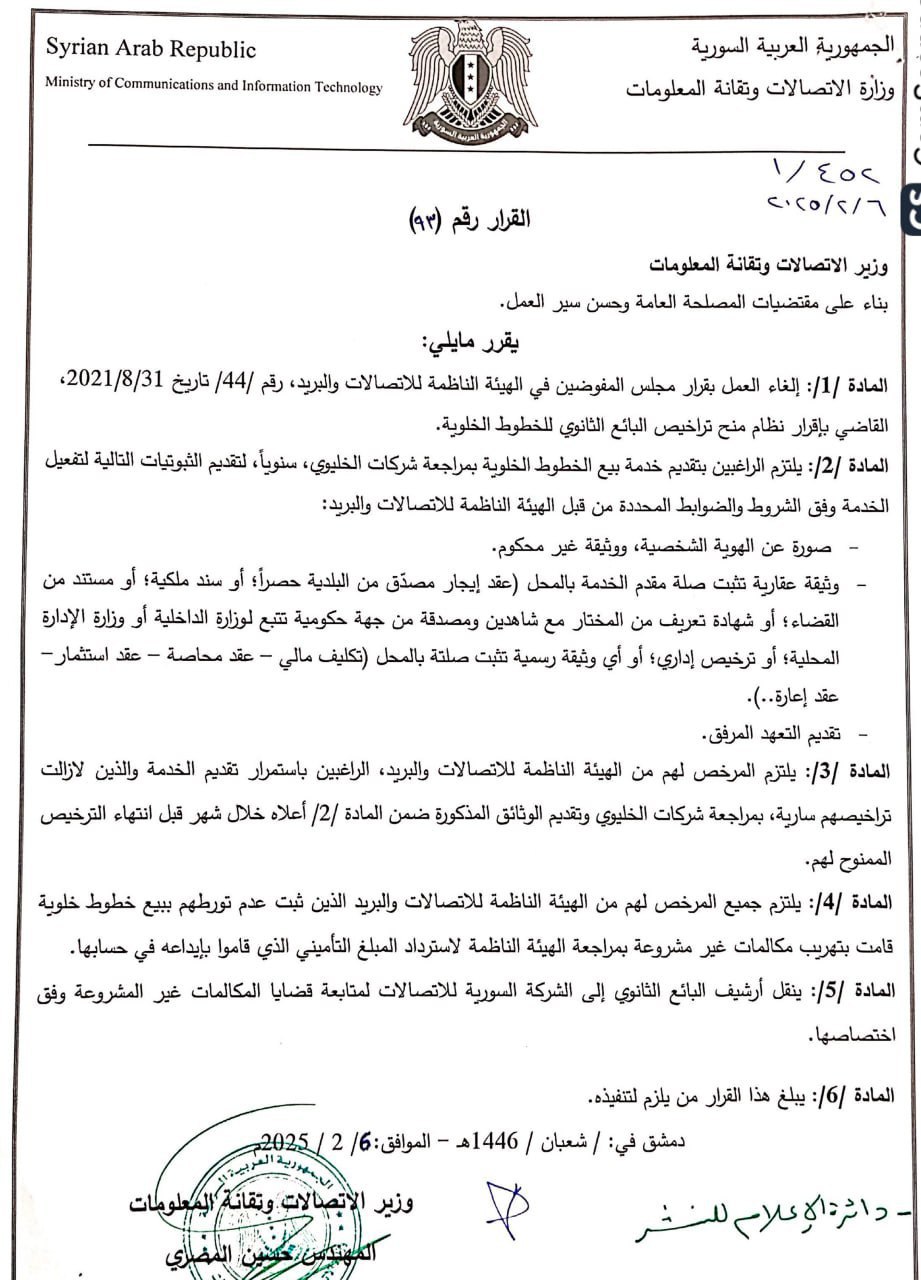 المادة /1/: إلغاء العمل بقرار مجلس المفوضين في الهيئة الناظمة للاتصالات والبريد، رقم /44/ تاريخ 2021/8/31 القاضي بإقرار نظام منح تراخيص البائع الثانوي للخطوط الخلوية.