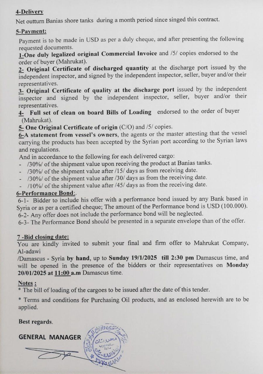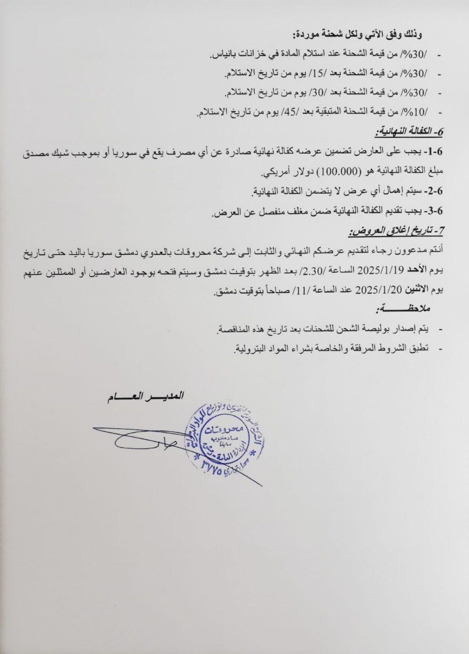 أنتم مدعوون رجاء لتقديم عرضكم النهائي والثابت إلى شركة محروقات بالعدوي دمشق سوريا باليد حتى تاريخ يوم الأحد 2025/1/19 الساعة / 2.30 / بعد الظهر بتوقيت دمشق وسيتم فتحه بوجود العارضين أو الممثلين عنهم يوم الاثنين 2025/1/20 عند الساعة / 11 / صباحاً بتوقيت دمشق.