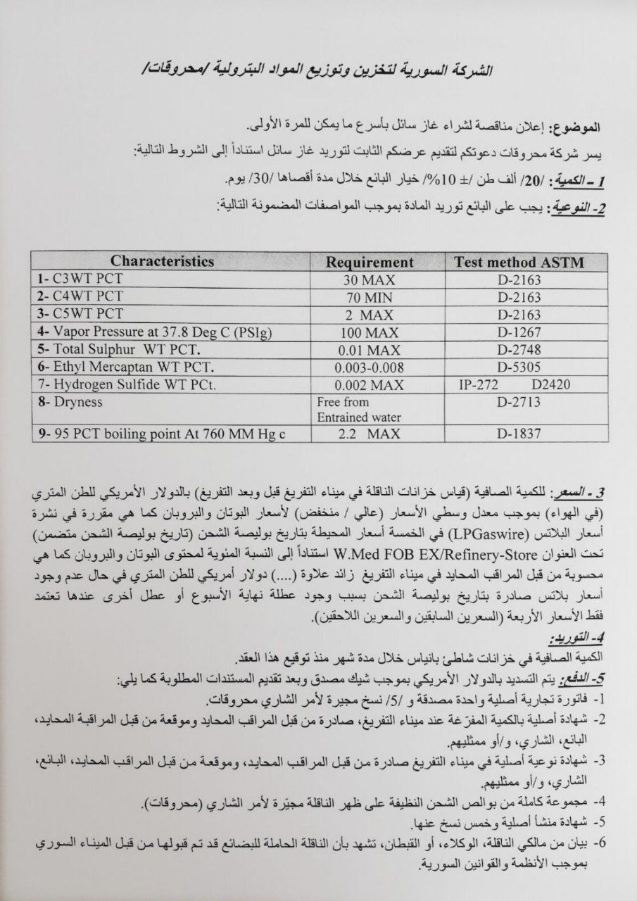 الموضوع: إعلان مناقصة لشراء غاز سائل بأسرع ما يمكن للمرة الأولى.