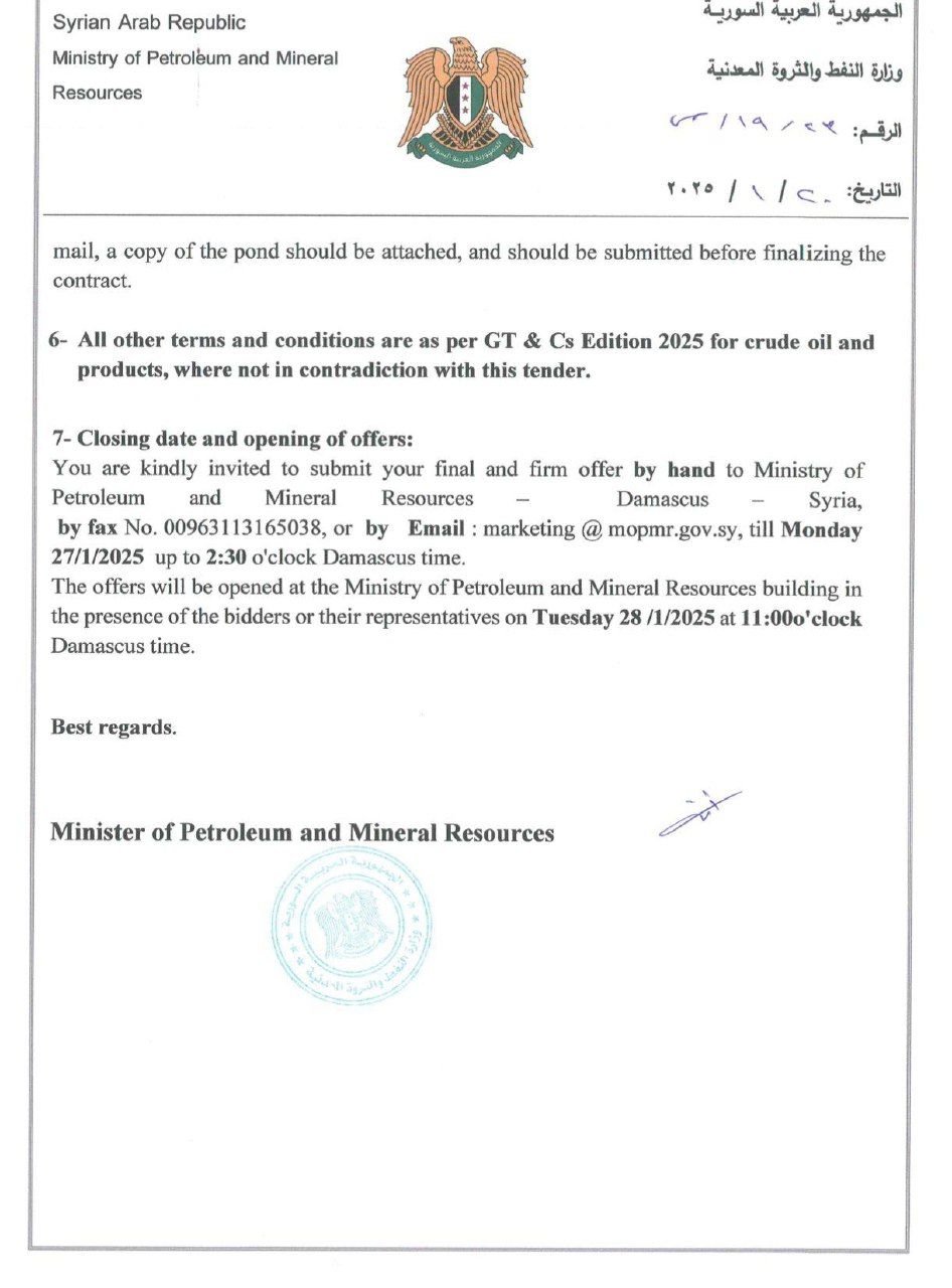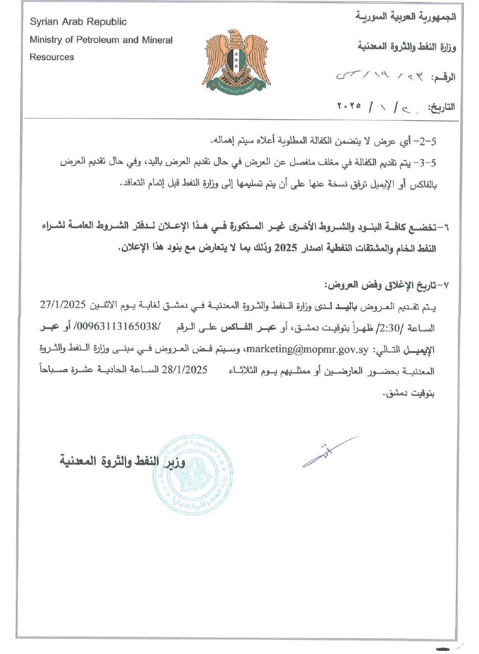 يتم تقديم العروض باليد لدى وزارة النفط والثروة المعدنية في دمشق لغاية يوم الاثنين 27/1/2025 الساعة 2:30 / ظهراً بتوقيت دمشق، أو عبر الفاكس على الرقم 00963113165038 أو عبر الإيميل التالي : [[email protected]](mailto:[email protected])، وسيتم فض العروض في مبنى وزارة النفط والثروة المعدنية بحضور العارضين أو ممثليهم يوم الثلاثاء 28/1/2025 الساعة الحادية عشرة صباحاً بتوقيت دمشق.