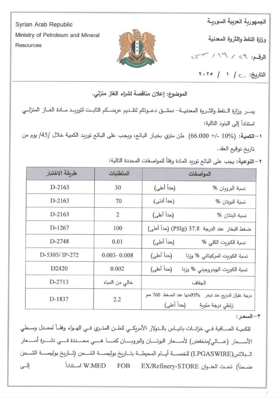 يسر وزارة النفط والثروة المعدنية - دمشق دعوتكم لتقديم عرضكم الثابت لتوريد مادة الغاز المنزلي