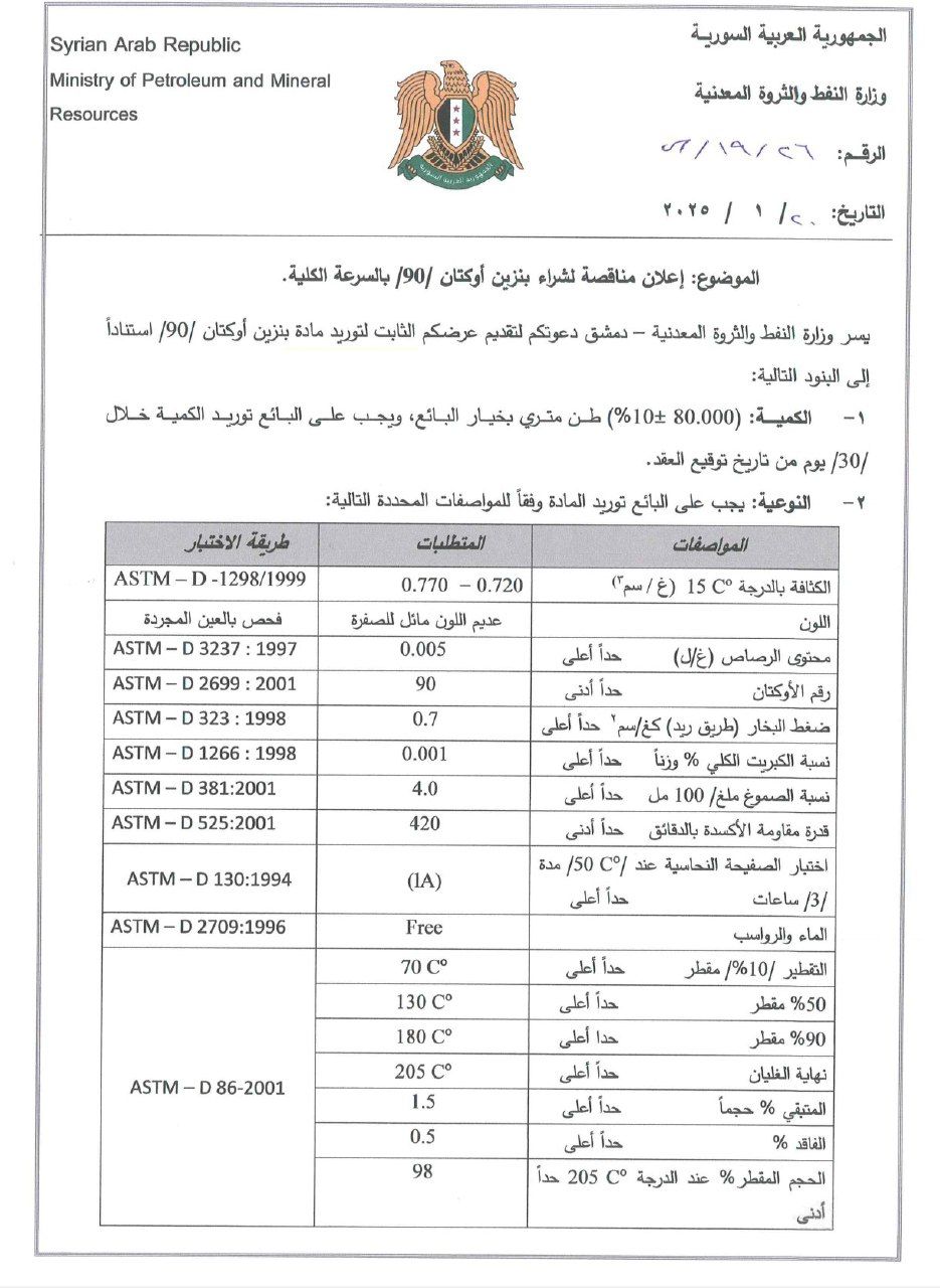 يسر وزارة النفط والثروة المعدنية - دمشق دعوتكم لتقديم عرضكم الثابت لتوريد مادة بنزين أوكتان /90/ استناداً إلى البنود التالية: