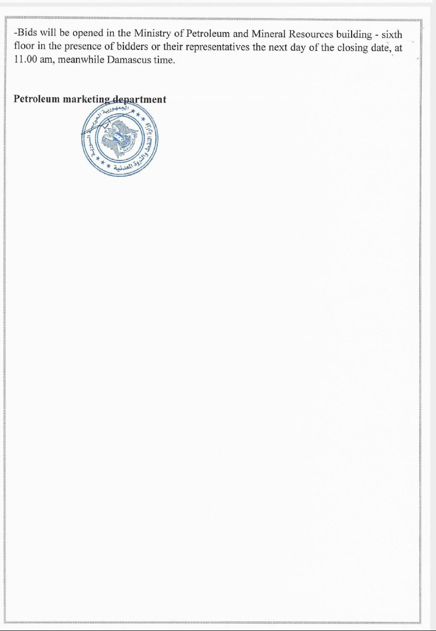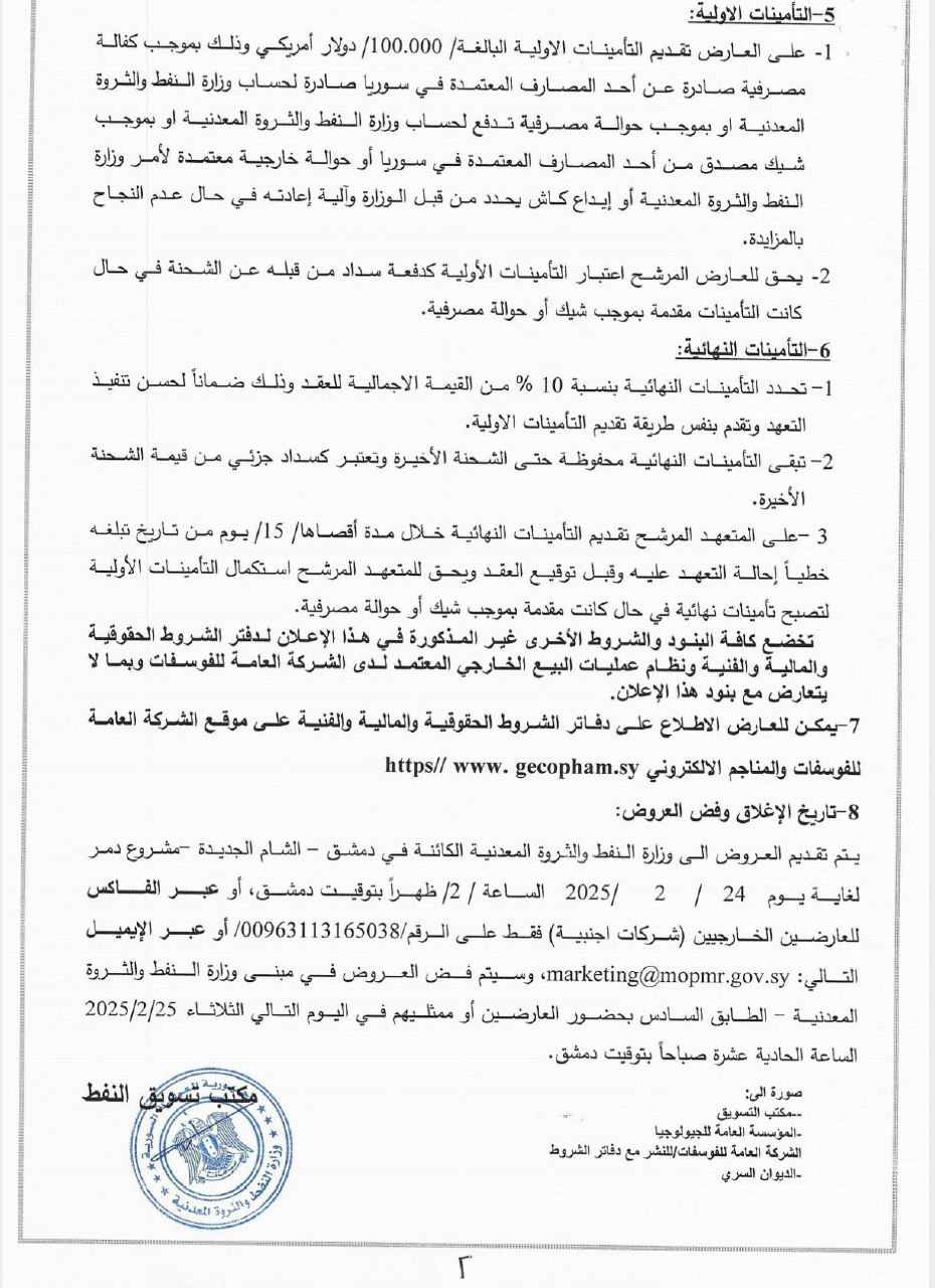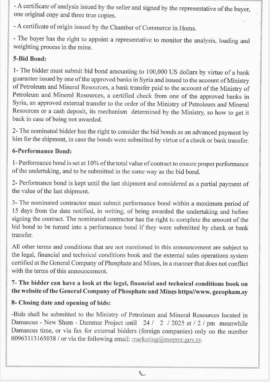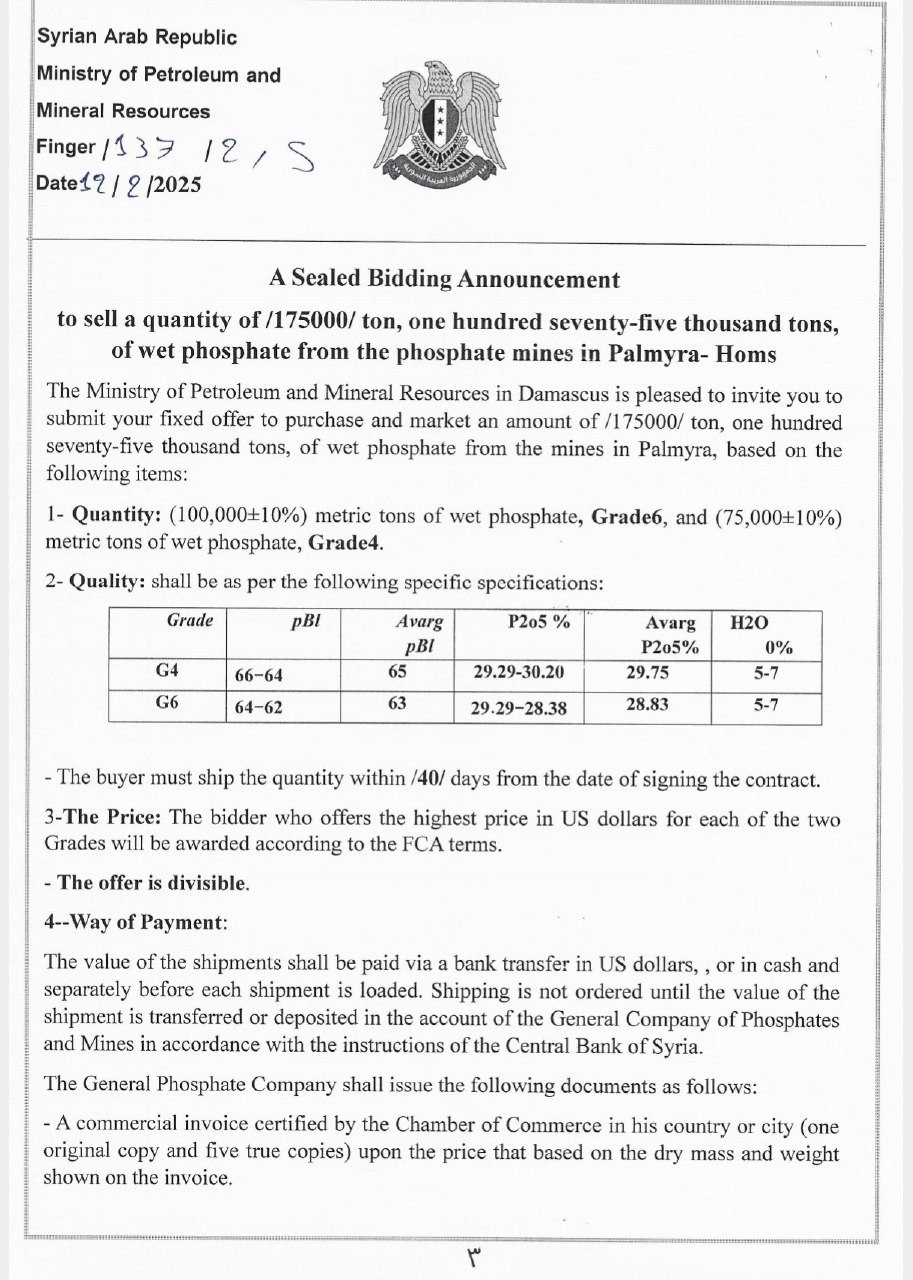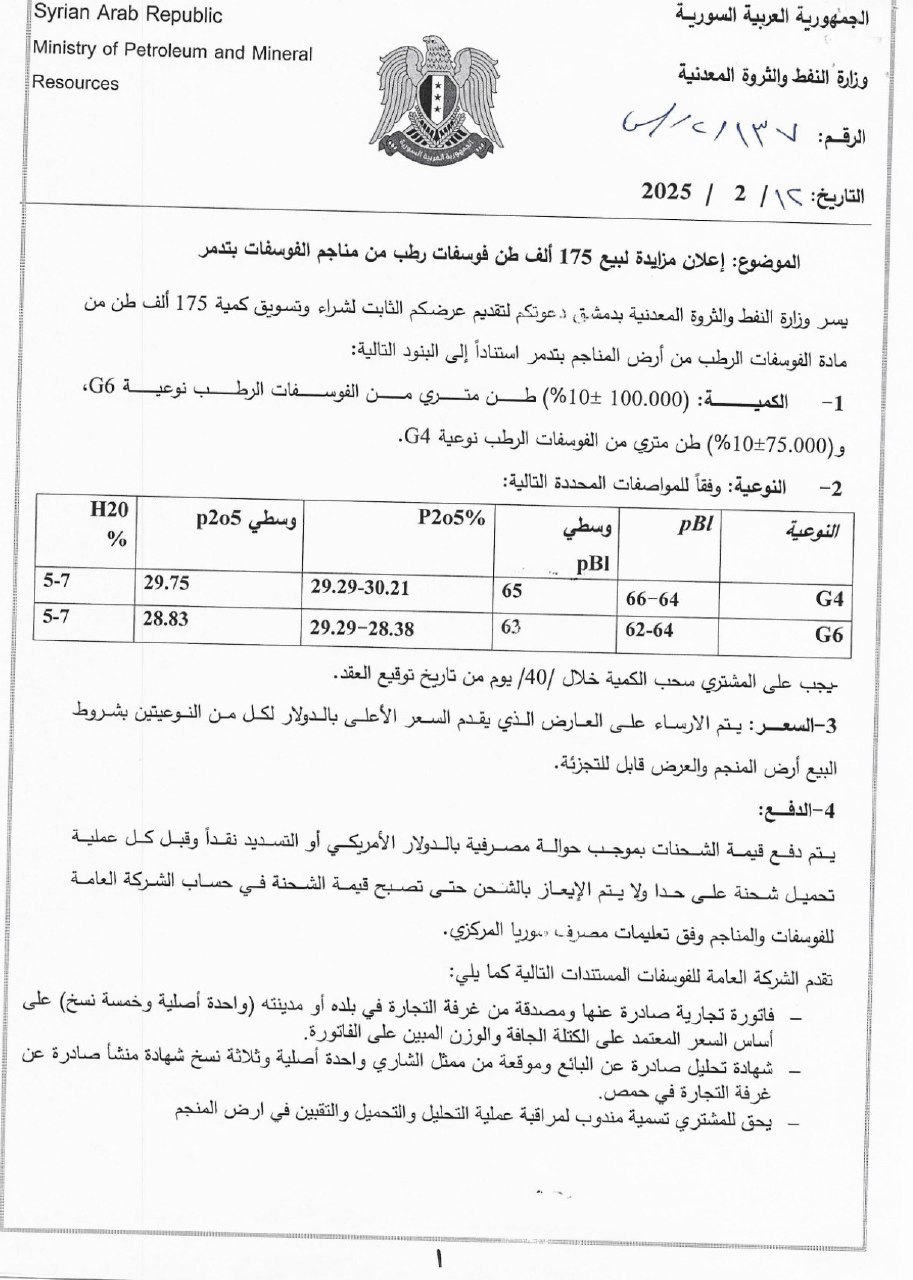 يسر وزارة النفط والثروة المعدنية بدمشق دعوتكم لتقديم عرضكم الثابت لشراء وتسويق كمية 175 ألف طن من مادة الفوسفات الرطب من أرض المناجم بتدمر استناداً إلى البنود التالية:
