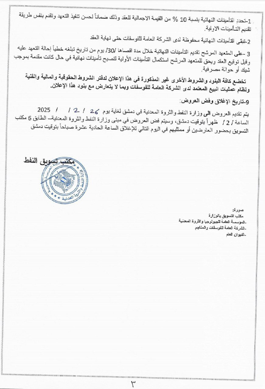 2025 /يتم تقديم العروض الى وزارة النفط والثروة المعدنية في دمشق لغاية يوم 26 / 2 /الساعة / 2 / ظهراً بتوقيت دمشق، وسيتم فض العروض في مبنى وزارة النفط والثروة المعدنية الطابق 6 مكتب التسويق بحضور العارضين أو ممثليهم في اليوم التالي للإغلاق الساعة الحادية عشرة صباحاً بتوقيت دمشق