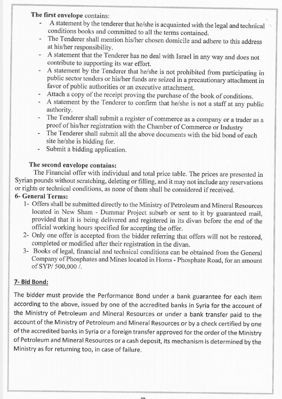 1 - تقدم العروض مباشرة إلى وزارة النفط والثروة المعدنية الكائنة في الشام الجديدة - مشروع دمر أو ترسل إليها بالبريد المضمون على أن تصل إليها وتسجل في ديوانها في كلا الحالتين قبل نهاية الدوام الرسمي المحدد لقبول العرض. 2 - لا يقبل من العارض إلا عرض وحيد ولا يجوز استعادة العروض أو إكمالها أو تعديلها بعد تسجيلها في الديوان العام. -3- يمكن الحصول على دفاتر الشروط الحقوقية والمالية والفنية من الشركة العامة للفوسفات والمناجم الكائنة في حمص - طريق الفوسفات مقابل مبلغ وقدره 500 ألف ل س