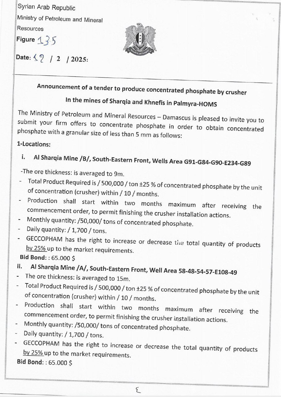 يسر وزارة النفط والثروة المعدنية - دمشق دعوتكم لتقديم عرضكم الثابت لأعمال تركيز الفوسفات للحصول على فوسفات مركز بحجم حبيبي أقل من 5 مم كمايلي: