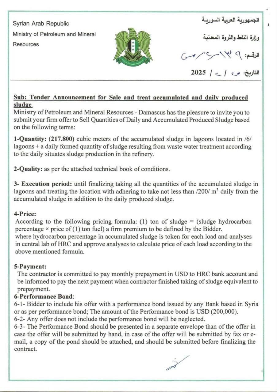 يسر وزارة النفط والثروة المعدنية دعوتكم لتقديم عرضكم الثابت لبيع ومعالجة مادة المقام اليومي والمتراكم في الشركة العامة المحبة استناداً إلى البنود التالية: