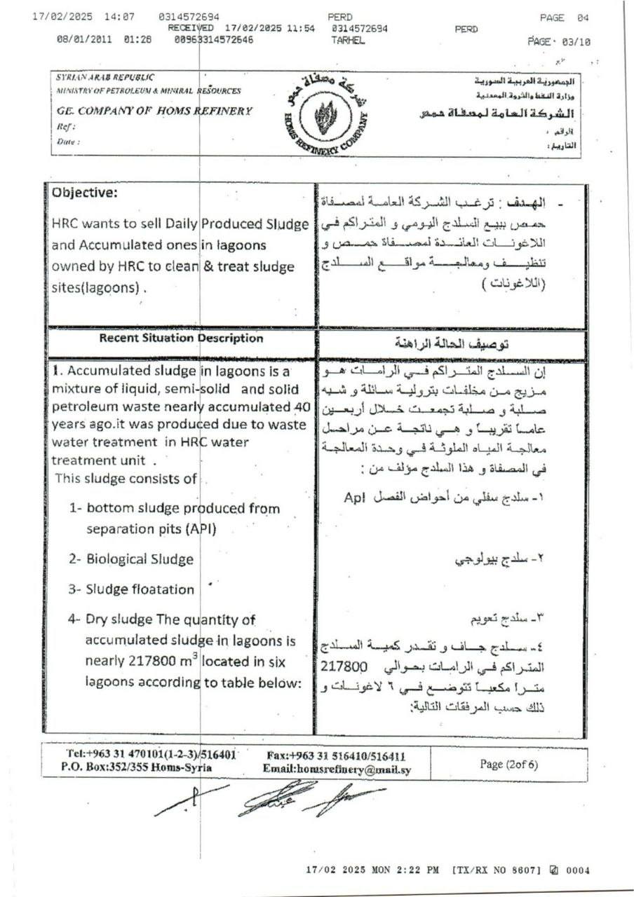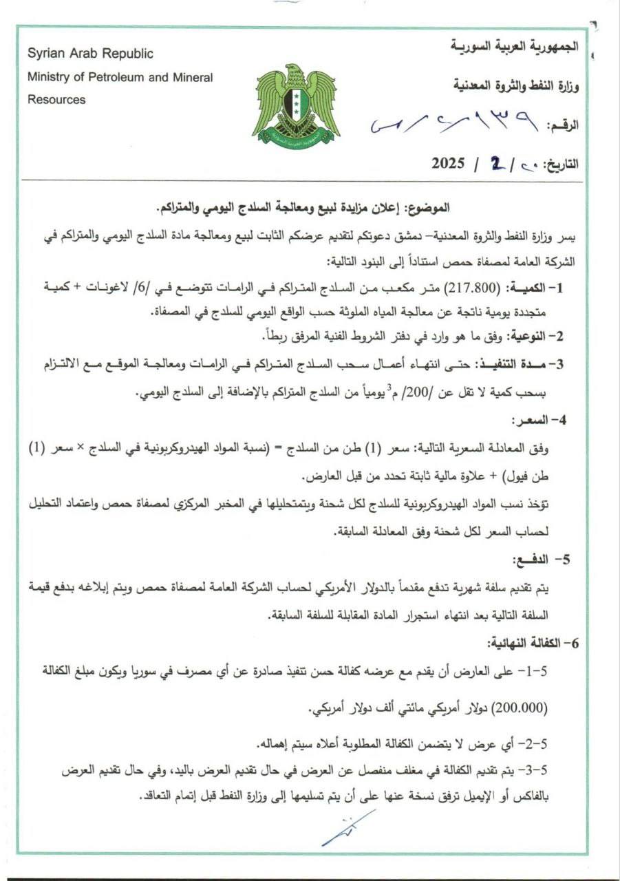 وزارة النفط تعلن عن مزايدة لمعالجة وبيع السلدج النفطي المتراكم في مصفاة حمص