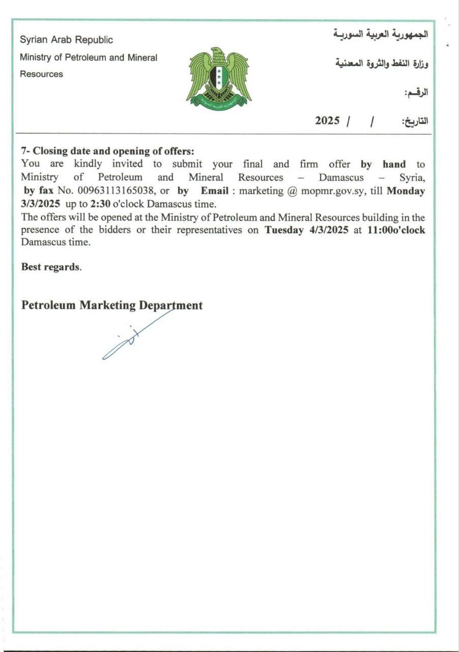 يتم تقديم العروض باليد لدى وزارة النفط والثروة المعدنية في دمشق لغاية يوم الاثنين 3/3/2025 الساعة 2:30/ظهراً بتوقيت دمشق، أو عبر الفاكس على الرقم / 00963113165038 أو عبر الإيميل التالي: @marketing mopmr.gov.sy، وسيتم فض العروض في مبنى وزارة النفط والثروة المعدنية بحضور العارضين أو ممثليهم يوم الثلاثاء 4/3/2025 الساعة الحادية عشرة صباحاً بتوقيت دمشق.
