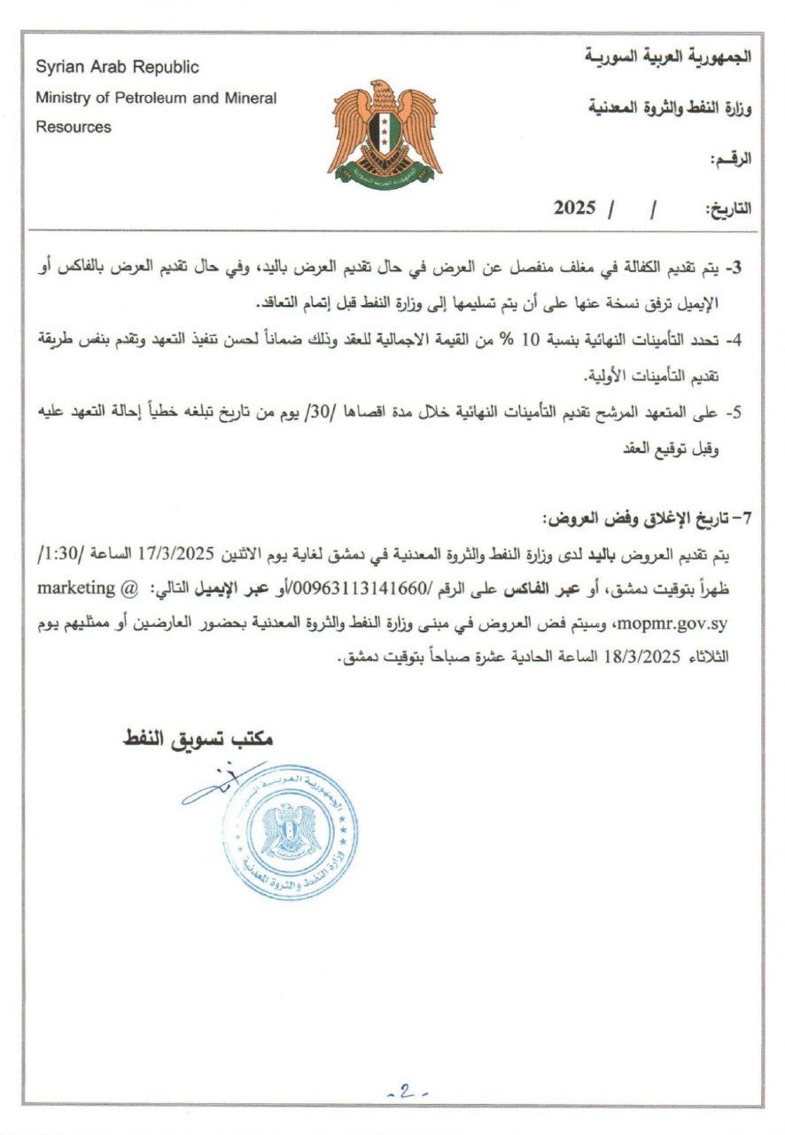 يتم تقديم العروض باليد لدى وزارة النفط والثروة المعدنية في دمشق لغاية يوم الاثنين 17/3/2025 الساعة 1:30/ظهراً بتوقيت دمشق، أو عبر الفاكس على الرقم /00963113141660 أو عبر الإيميل التالي : @ marketing mopmr.gov.sy، وسيتم فض العروض في مبنى وزارة النفط والثروة المعدنية بحضور العارضين أو ممثليهم يوم الثلاثاء 18/3/2025 الساعة الحادية عشرة صباحاً بتوقيت دمشق.