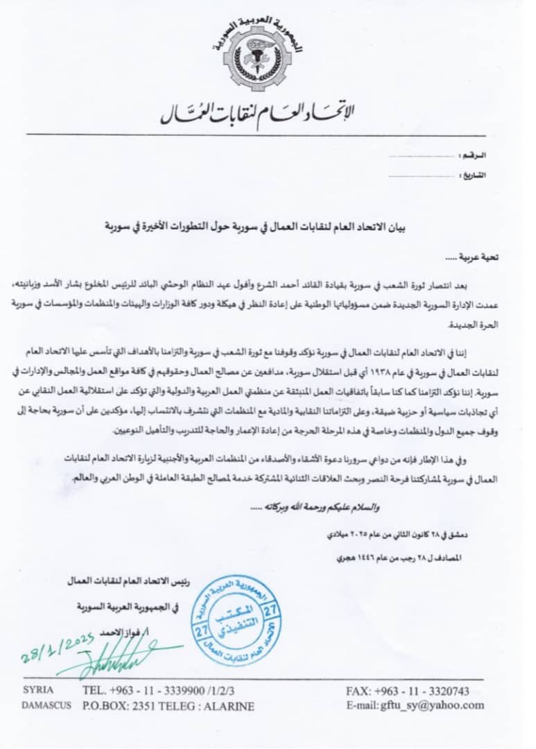 بيان الاتحاد العام لنقابات العمال في سورية حول التطورات الأخيرة في سورية