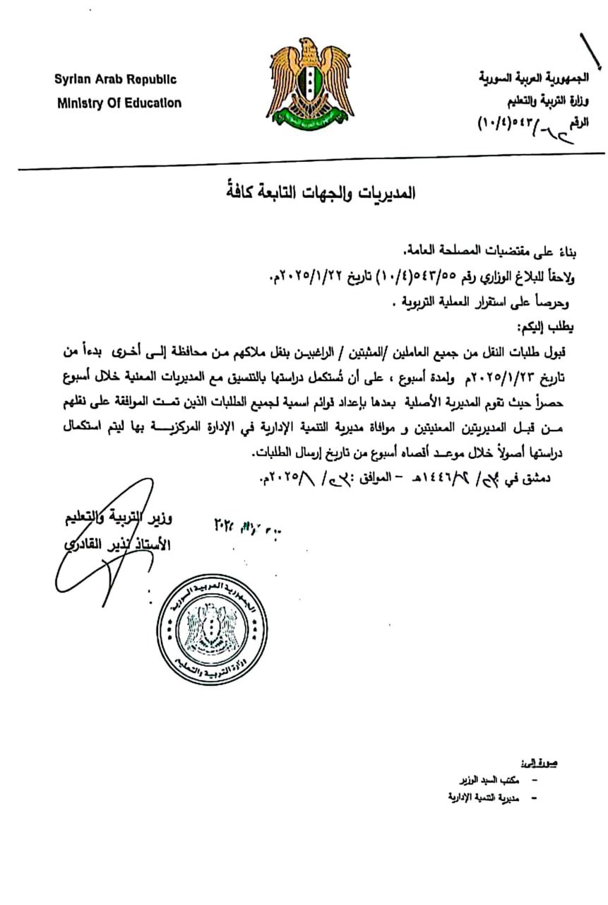 قبول طلبات النقل من جميع العاملين المثبتين / الراغبين بنقل ملاكهم من محافظة إلى أخرى بدءاً من تاريخ ٢٠٢٥/١/٢٣م ولمدة أسبوع ، على أن تستكمل دراستها بالتنسيق مع المديريات المعنية خلال أسبوع حصراً حيث تقوم المديرية الأصلية بعدها بإعداد قوائم اسمية لجميع الطلبات الذين تمت الموافقة على نقلهم من قبل المديريتين المعنيتين و موافاة مديرية التنمية الإدارية في الإدارة المركزية بها ليتم استكمال دراستها أصولاً خلال موعد أقصاه أسبوع من تاريخ إرسال الطلبات.