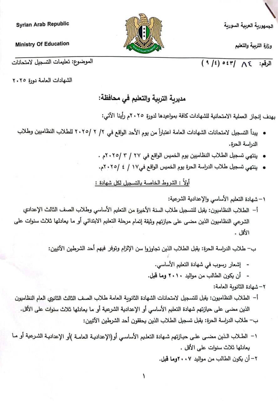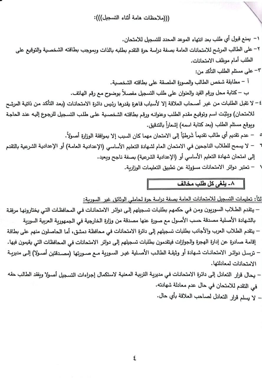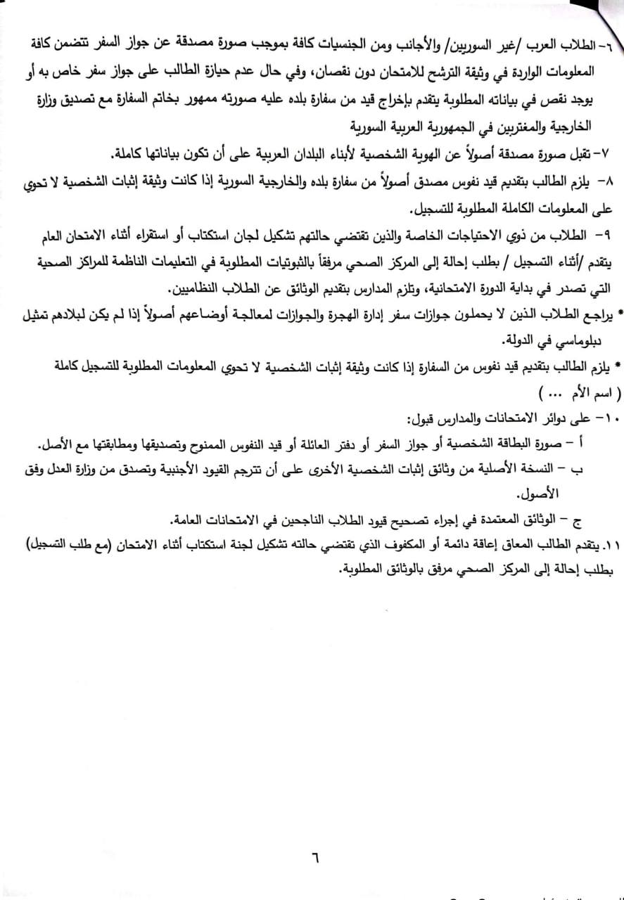 - يتقدم الطلاب السوريون ومن في حكمهم بطلبات تسجيلهم إلى دوائر الامتحانات في المحافظات التي يختارونها مرفقة بالشهادة الأصلية مصدقة حسب الأصول مع صورة عنها مصدقة من وزارة الخارجية في الجمهورية العربية السورية