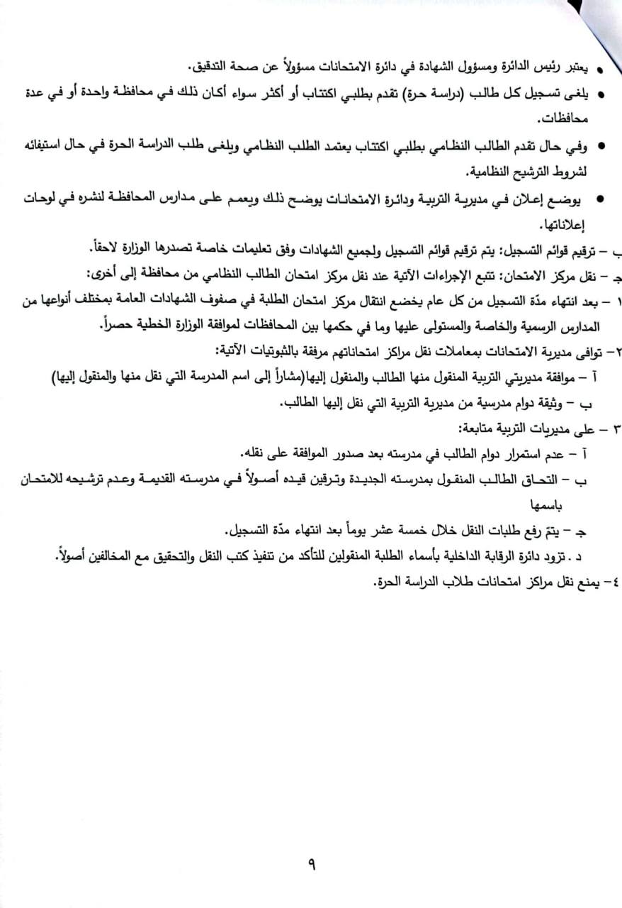 ٩- يعتبر الطالب النظامي المداوم في السنة الأخيرة من التعليم الأساسي أو الثالث الثانوي في مدرسته حتى نهاية التسجيل مرشحاً حكماً لامتحان الشهادة ضمن فرعه وتتضمن قوائم الترشيح اسمه وإن لم يتقدم بالثبوتيات لتسجيله ولا يمنح بطاقة الاكتتاب إذا لم يستكمل تسجيله للامتحان.