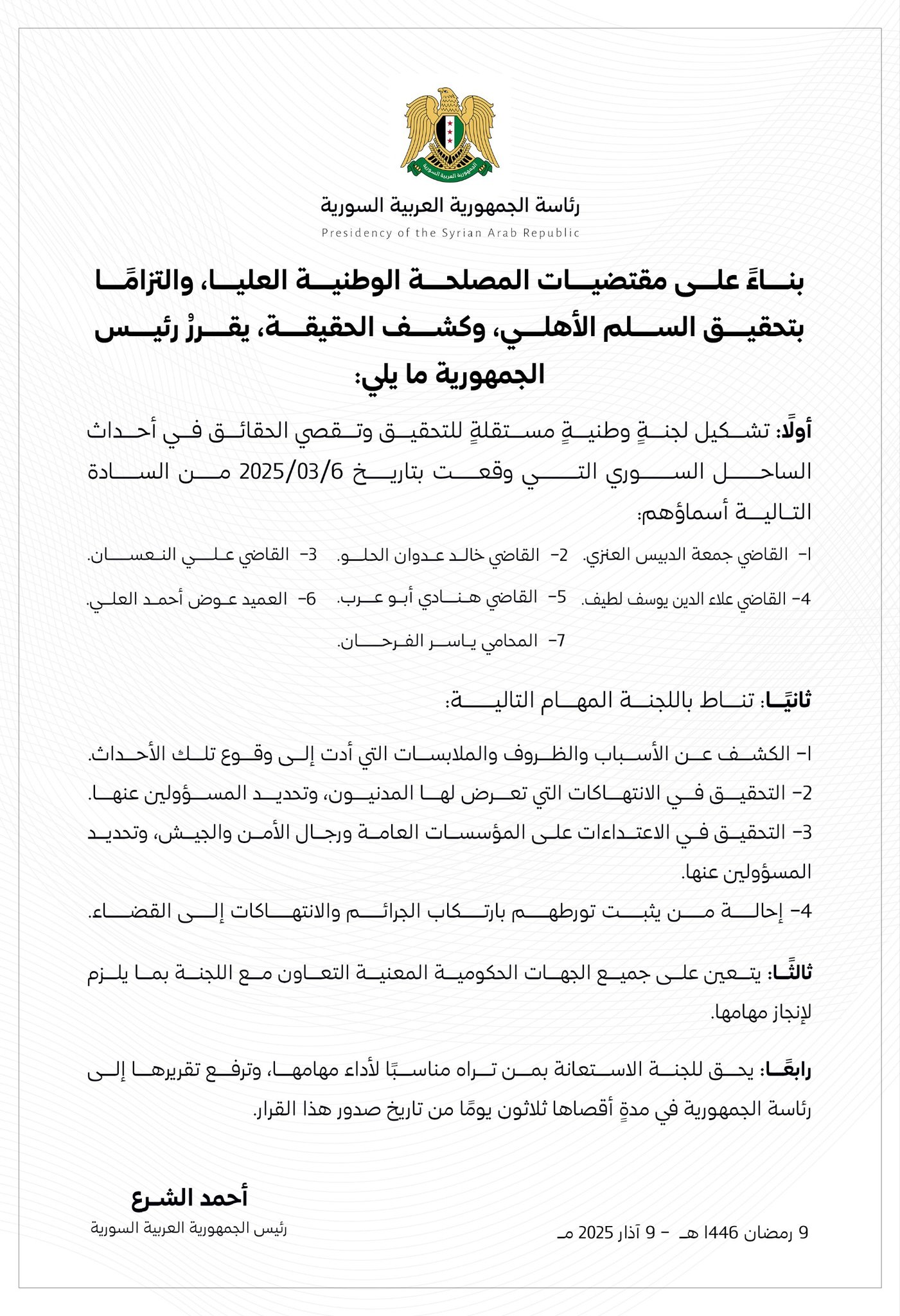 قرار رئاسي بتشكيل لجنة وطنية مستقلة للتحقيق وتقصي الحقائق في أحداث الساحل السوري