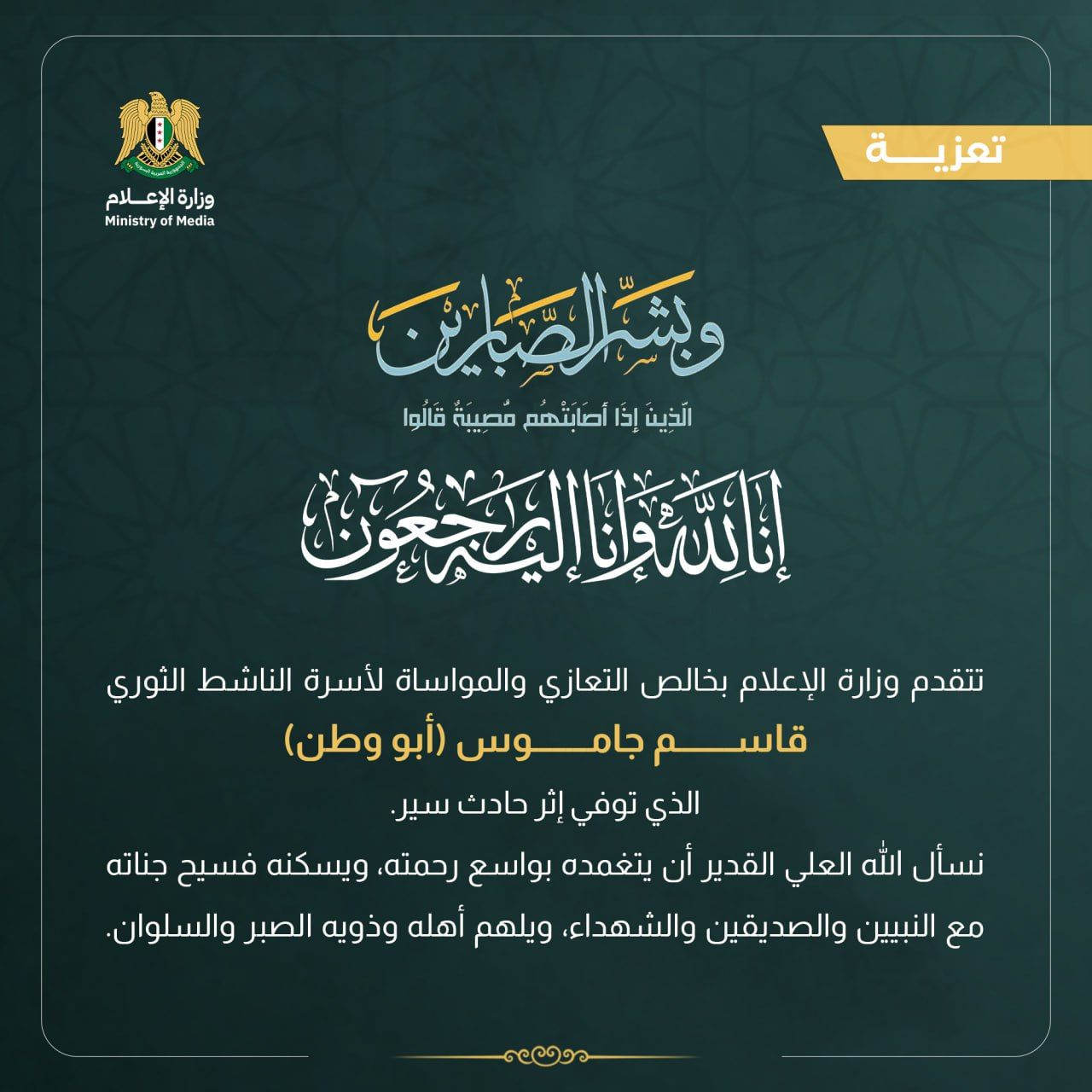 تتقدم وزارة الإعلام بخالص التعازي والمواساة لأسرة الناشط الثوري قاسم جاموس أبو وطن)
