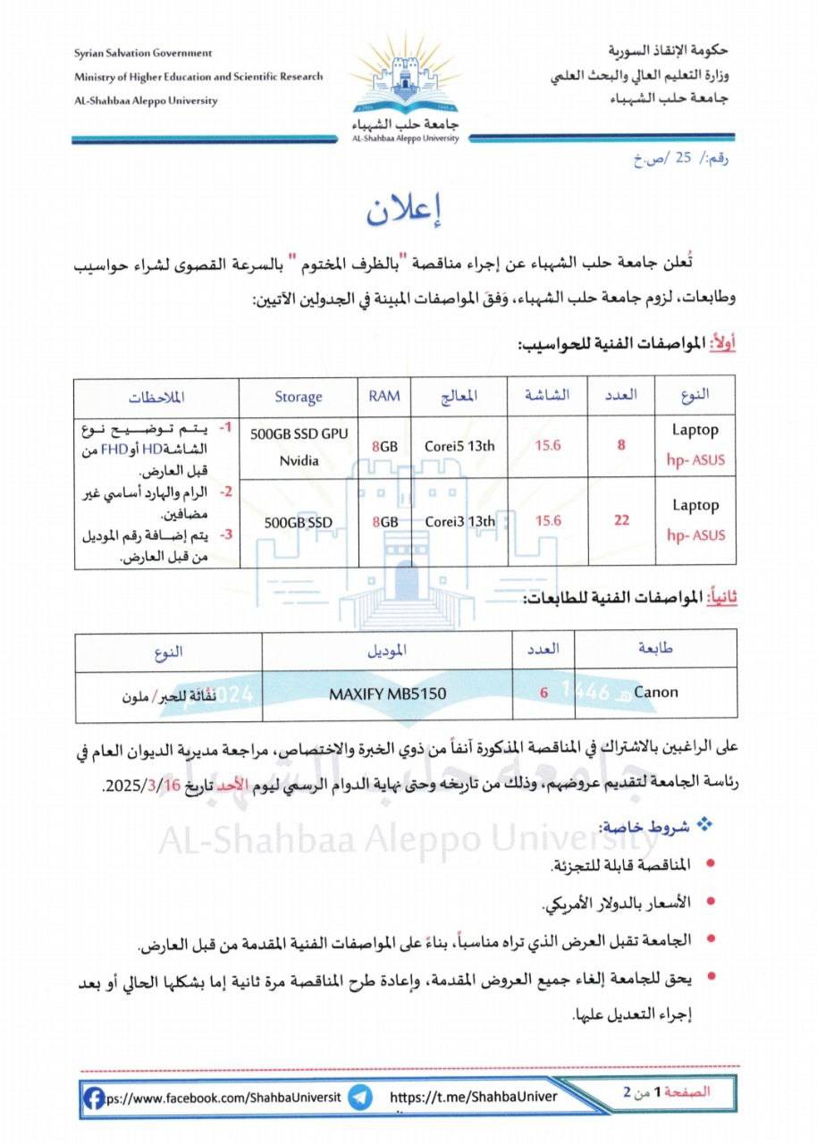 جامعة حلب الشهباء تعلن عن مناقصة عاجلة لتوريد حواسيب وطابعات