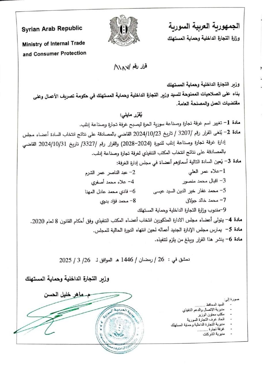 بالمصادقة على نتائج انتخاب المكتب التنفيذي لغرفة تجارة وصناعة إدلب.