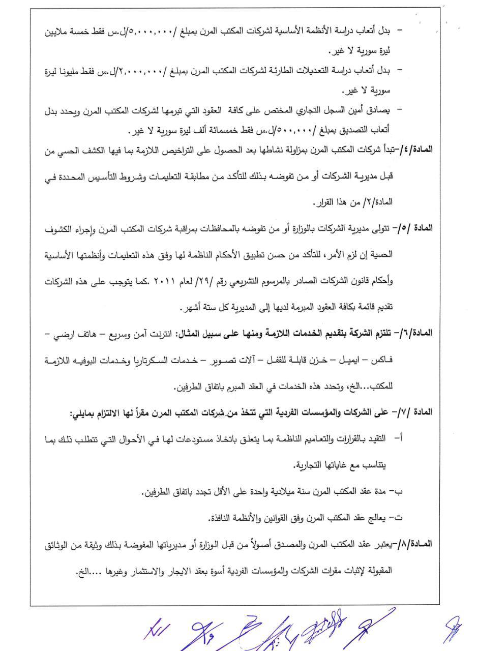 المادة / ٨/ - يعتبر عقد المكتب المرن والمصدق أصولاً من قبل الوزارة أو مديرياتها المفوضة بذلك وثيقة من الوثائق المقبولة لإثبات مقرات الشركات والمؤسسات الفردية أسوة بعقد الايجار والاستثمار وغيرها .... الخ.