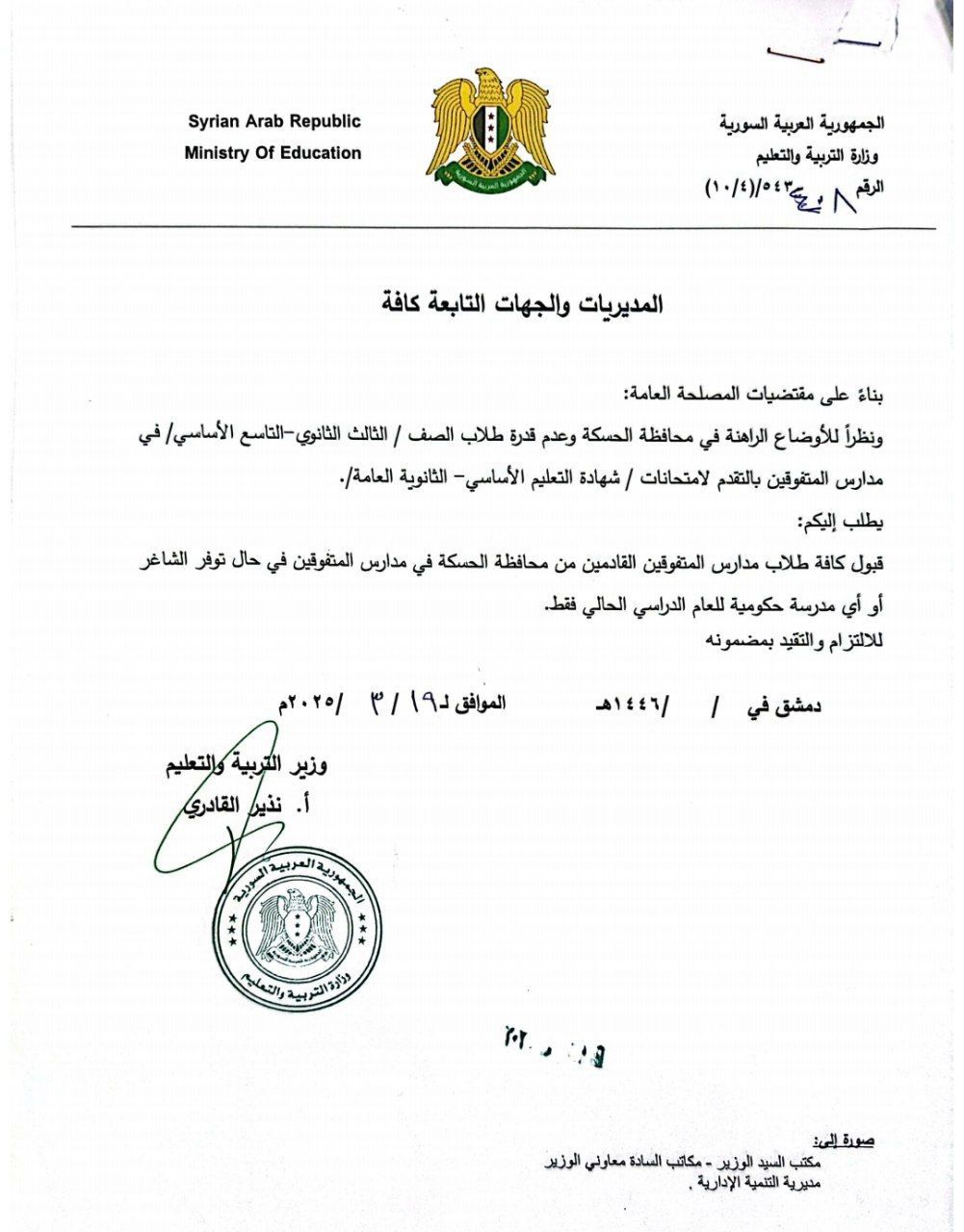 تعميم من وزير التربية والتعليم السوري: قبول طلاب مدارس المتفوقين القادمين من الحسكة في المحافظات
