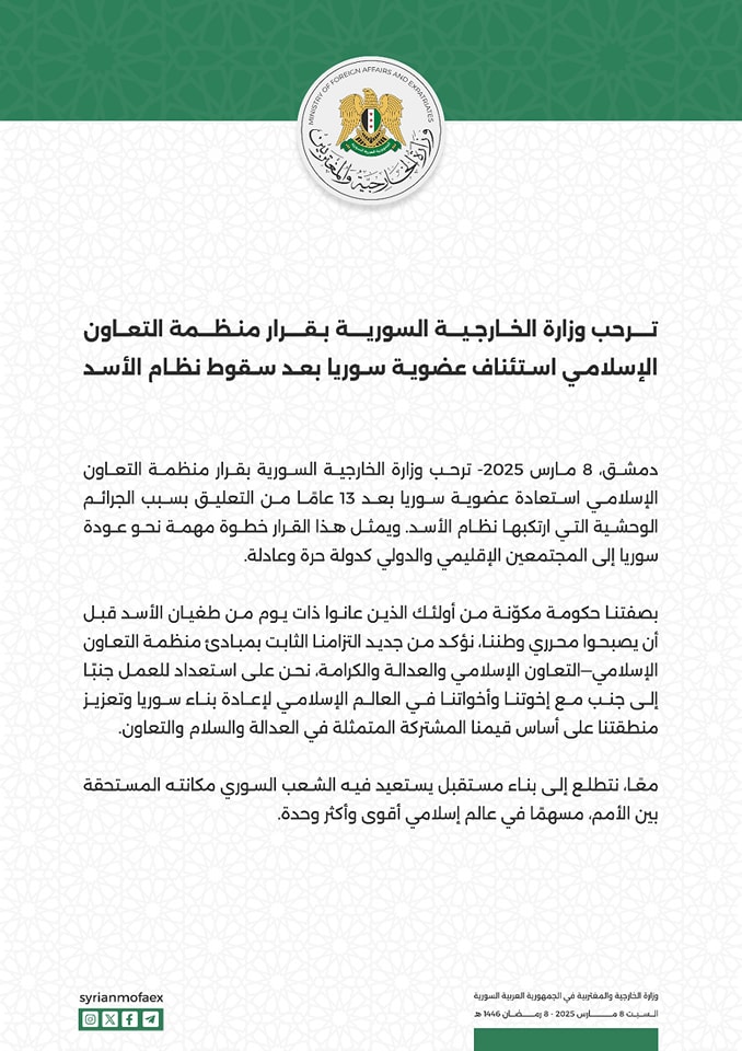 دمشق 8 مارس -2025 ترحب وزارة الخارجية السورية بقرار منظمة التعاون الإسلامي استعادة عضوية سوريا بعد 13 عامًا من التعليق بسبب الجرائم الوحشية التي ارتكبها نظام الأسد. ويمثل هذا القرار خطوة مهمة نحو عودة سوريا إلى المجتمعين الإقليمي والدولي كدولة حرة وعادلة.