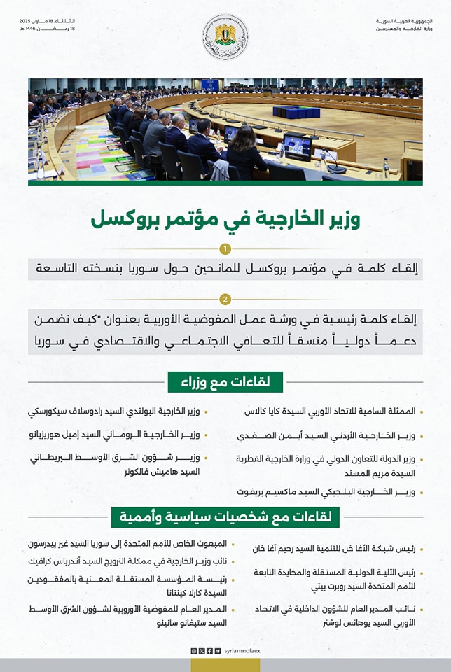 تصريح وزارة الخارجية والمغتربين: تفاصيل مشاركة وزير الخارجية أسعد الشيباني في مؤتمر بروكسل