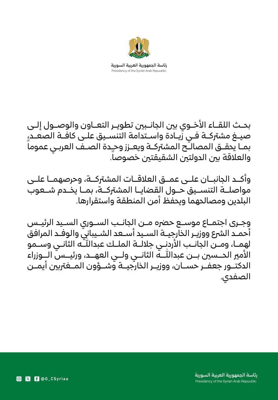 تصريح صحفي: زيارة الرئيس السوري أحمد الشرع إلى المملكة الأردنية الهاشمية للبحث في عدة قضايا