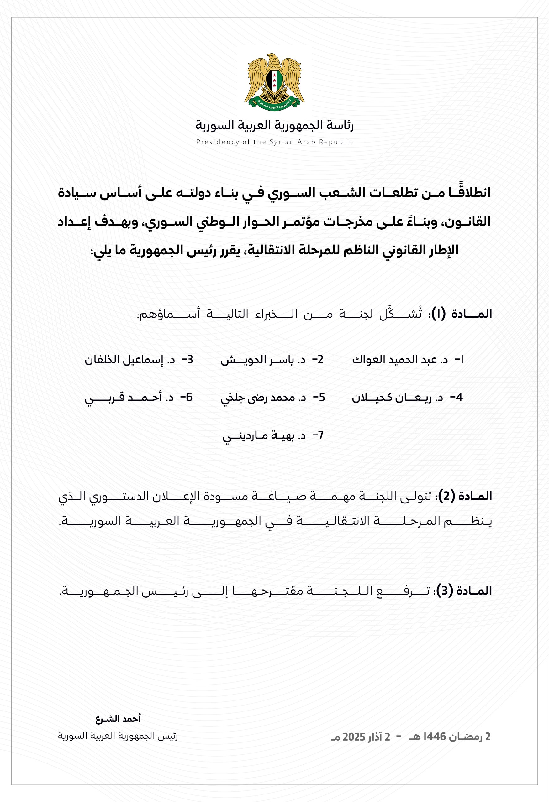 المادة (2): تتولى اللجنة مهمة صياغة مسودة الإعلان الدستوري الذي ينظم المرحلة الانتقالية في الجمهورية العربية السورية.