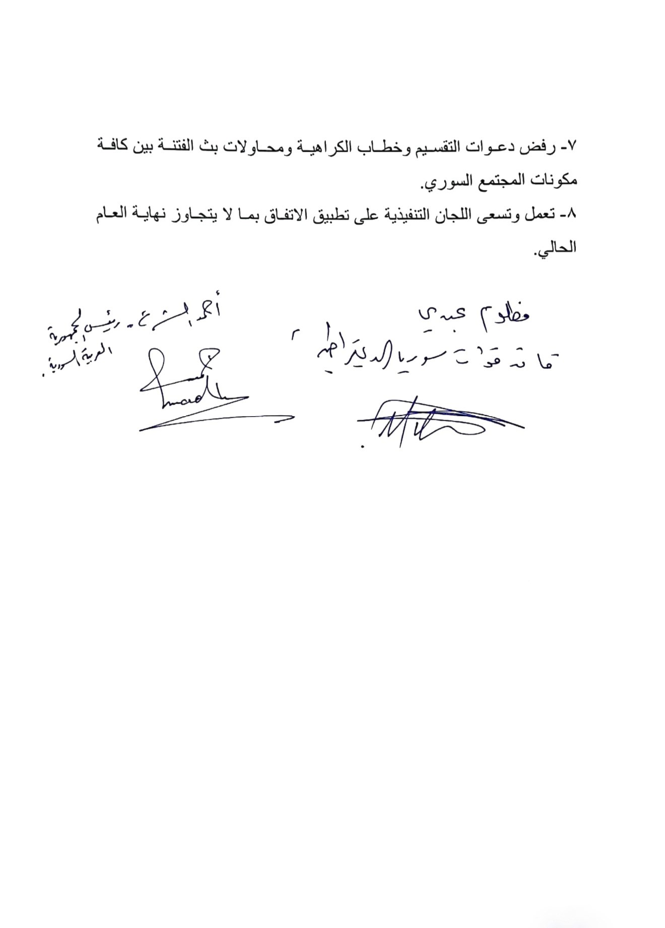 بناء على اجتماع جرى بين السيد الرئيس أحمد الشرع والسيد مظلوم عبدي في يوم الأثنين الموافق لـ 10آذار 2025، تم الاتفاق على ما يلي: