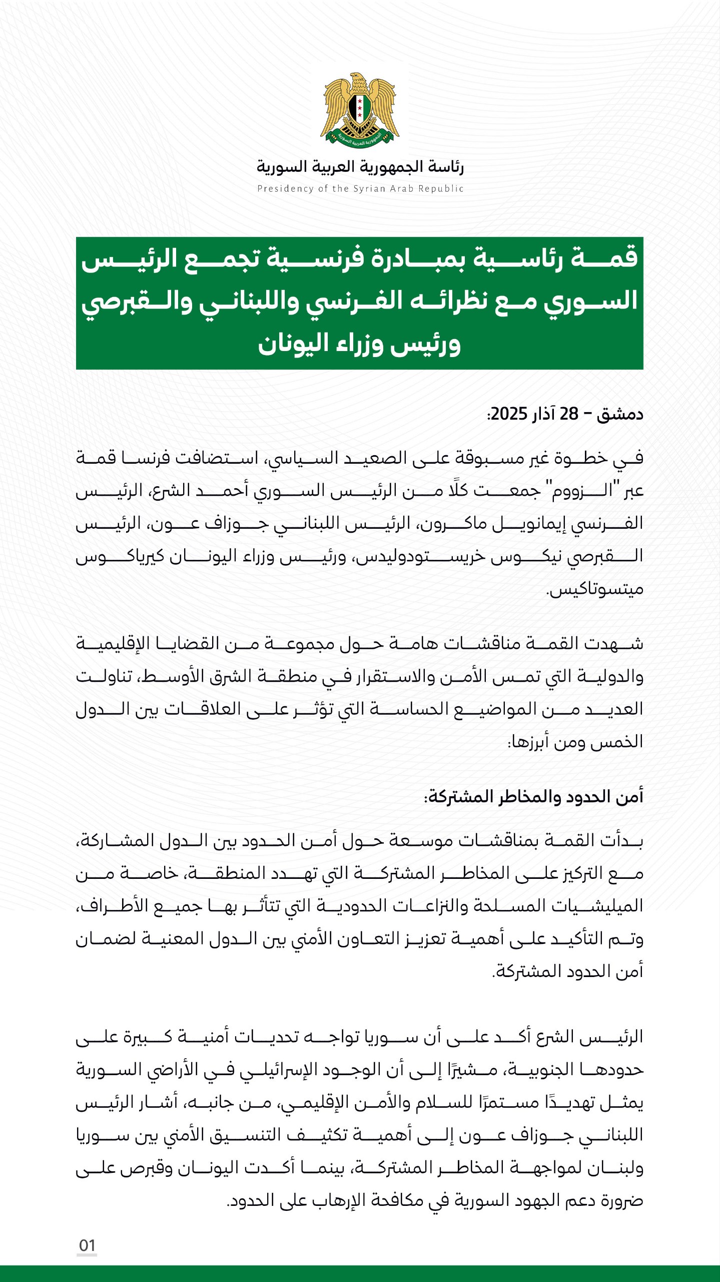 الرئيس الشرع أكد على أن سوريا تواجه تحديات أمنية كبيرة على حدودها الجنوبية، مشيرًا إلى أن الوجود الإسرائيلي في الأراضي السورية يمثل تهديدا مستمرا للسلام والأمن الإقليمي، من جانبه، أشار الرئيس اللبناني جوزاف عون إلى أهمية تكثيف التنسيق الأمني بين سوريا ولبنان لمواجهة المخاطر المشتركة، بينما أكدت اليونان وقبرص على ضرورة دعم الجهود السورية في مكافحة الإرهاب على الحدود.