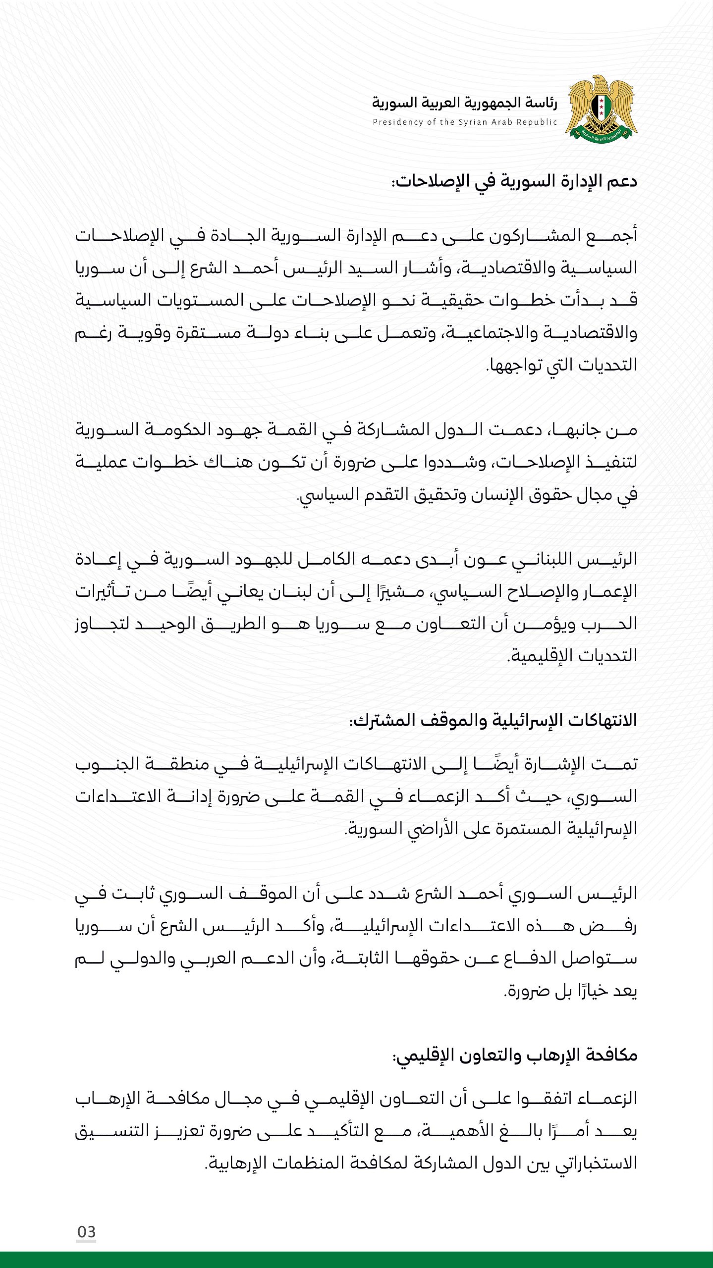 من جانبها، دعمت الدول المشاركة في القمة جهود الحكومة السورية لتنفيذ الإصلاحات، وشددوا على ضرورة أن تكون هناك خطوات عملية في مجال حقوق الإنسان وتحقيق التقدم السياسي.
