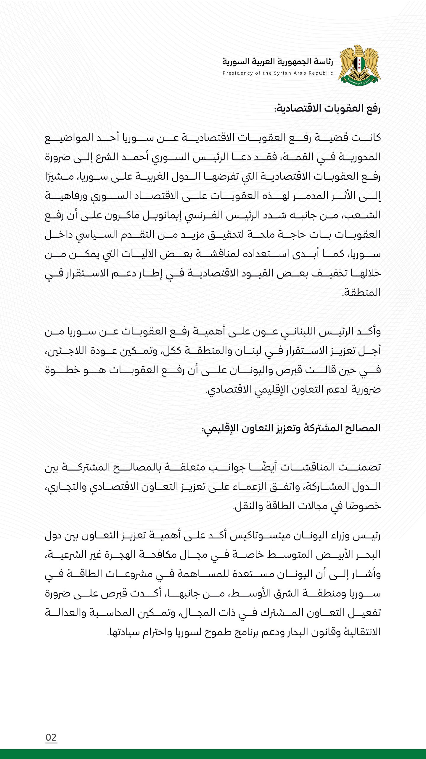 وأكد الرئيس اللبناني عون على أهمية رفع العقوبات عن سوريا من أجل تعزيز الاستقرار في لبنان والمنطقة ككل، وتمكين عودة اللاجئين في حين قالت قبرص واليونان على أن رفع العقوبات هو خطوة ضرورية لدعم التعاون الإقليمي الاقتصادي.