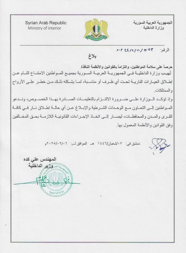 تهيب وزارة الداخلية في الجمهورية العربية السورية بجميع المواطنين الامتناع التام عن إطلاق العيارات النارية تحت أي ظرف أو مناسبة، لما يشكله ذلك من خطر على الأرواحوالممتلكات.