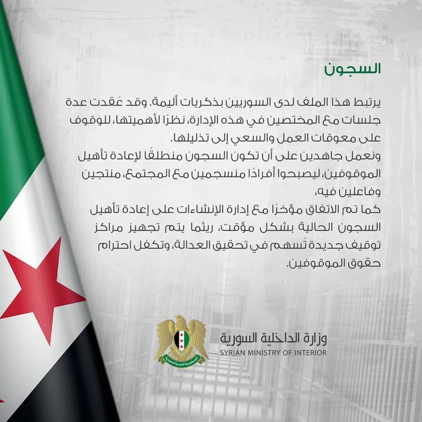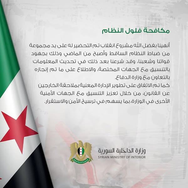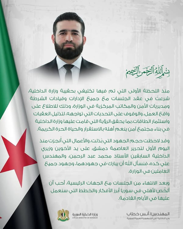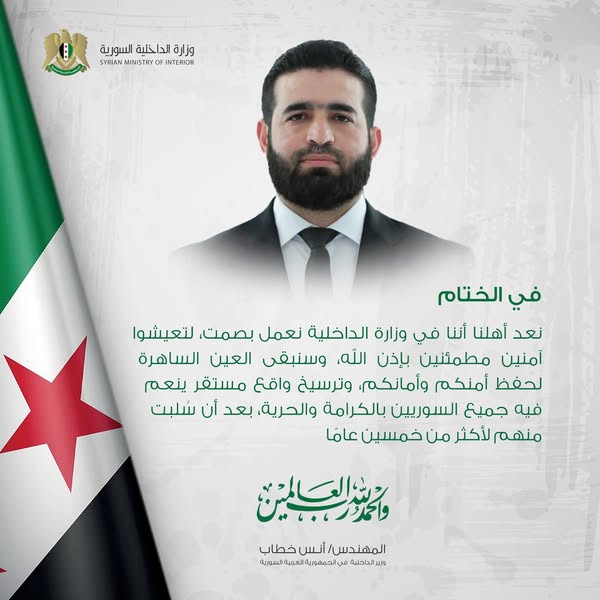 نعد أهلنا أننا في وزارة الداخلية نعمل بصمت، لتعيشوا آمنين مطمئنين بإذن الله، وسنبقى العين الساهرة لحفظ أمنكم وأمانكم، وترسيخ واقع مستقر ينعم فيه جميع السوريين بالكرامة والحرية، بعد أن سلبت منهم لأكثر من خمسين عاما