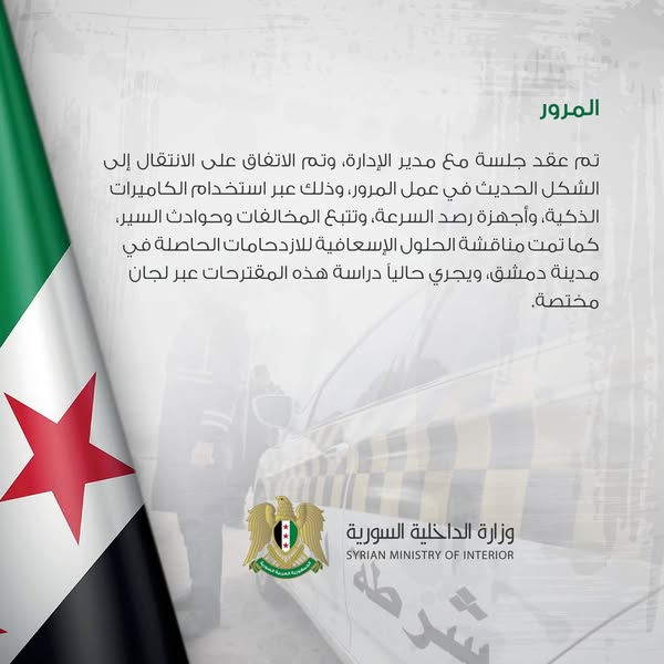 تم عقد جلسة مع مدير الإدارة، وتم الاتفاق على الانتقال إلى الشكل الحديث في عمل المرور، وذلك عبر استخدام الكاميرات الذكية، وأجهزة رصد السرعة، وتتبع المخالفات وحوادث السير، كما تمت مناقشة الحلول الإسعافية للازدحامات الحاصلة في مدينة دمشق، ويجري حالياً دراسة هذه المقترحات عبر لجان مختصة.