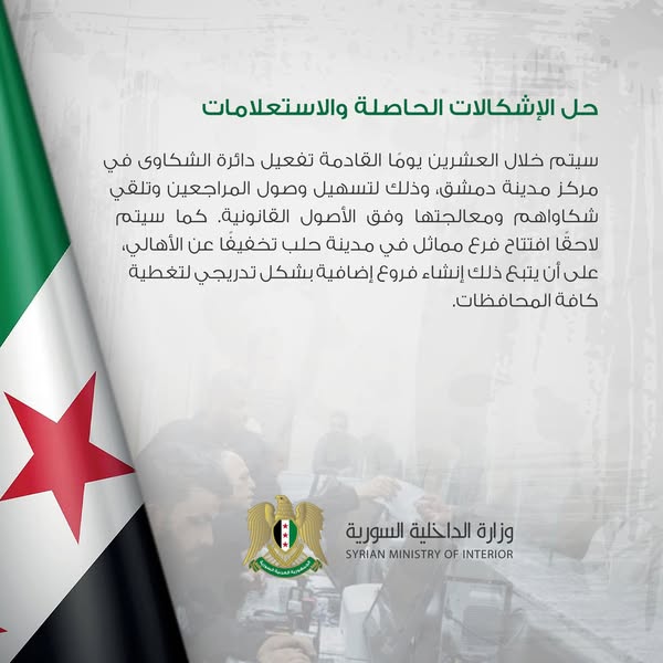 سيتم خلال العشرين يوما القادمة تفعيل دائرة الشكاوى في مركز مدينة دمشق، وذلك لتسهيل وصول المراجعين وتلقي شكاواهم ومعالجتها وفق الأصول القانونية. كما سيتم لاحقا افتتاح فرع مماثل في مدينة حلب تخفيفا عن الأهالي، على أن يتبع ذلك إنشاء فروع إضافية بشكل تدريجي لتغطية كافة المحافظات.