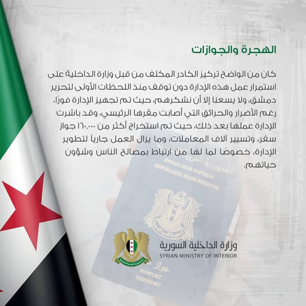 كان من الواضح تركيز الكادر المكلف من قبل وزارة الداخلية على استمرار عمل هذه الإدارة دون توقف منذ اللحظات الأولى لتحرير دمشق، ولا يسعنا إلا أن نشكرهم، حيث تم تجهيز الإدارة فورا رغم الأضرار والحرائق التي أصابت مقرها الرئيسي، وقد باشرت الإدارة عملها بعد ذلك، حيث تم استخراج أكثر من ١٦٠,٠٠٠ جواز سفر، وتسيير آلاف المعاملات، وما يزال العمل جارياً لتطوير الإدارة، خصوصًا لما لها من ارتباط بمصالح الناس وشؤون حياتهم. العربية