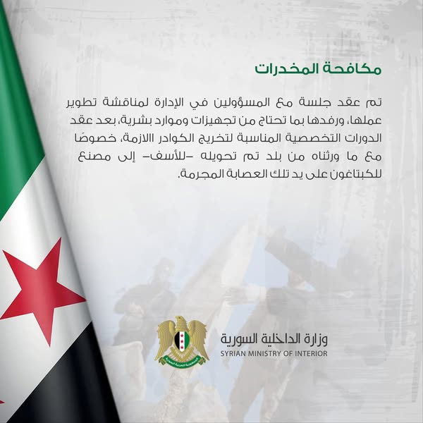 تم عقد جلسة مع المسؤولين في الإدارة لمناقشة تطوير عملها، ورفدها بما تحتاج من تجهيزات وموارد بشرية، بعد عقد الدورات التخصصية المناسبة لتخريج الكوادر الازمة، خصوصًا مع ما ورثناه من بلد تم تحويله للأسف- إلى مصنع للكبتاغون على يد تلك العصابة المجرمة.