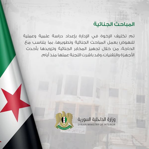 تم تكليف الإخوة في الإدارة بإعداد دراسة علمية وعملية للنهوض بعمل المباحث الجنائية وتطويرها، بما يتناسب مع الحاجة، من خلال تجهيز المخابر الجنائية وتزويدها بأحدث الأجهزة والتقنيات، وقد باشرت اللجنة عملها منذ أيام.