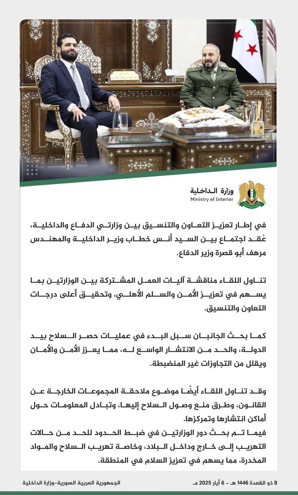 تصريح صحفي: اجتماع بين وزيري الداخلية والدفاع السوريين لبحث حصر السلاح وتعزيز التنسيق الأمني