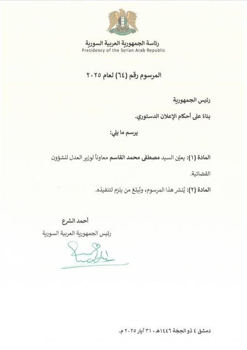 المرسوم 64 لعام 2025: تعيين السيد مصطفى محمد القاسم معاوناً لوزير العدل للشؤون القضائية