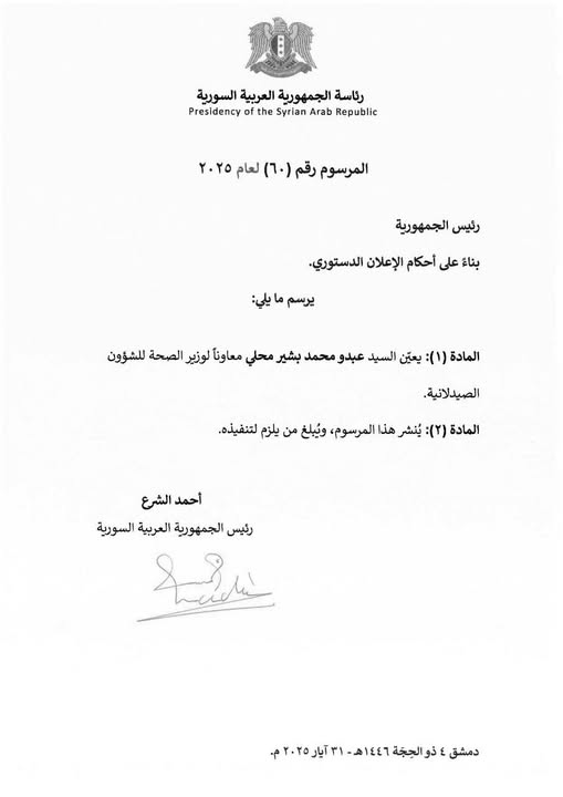 المرسوم 60 لعام 2025: تعيين السيد عبدو محمد بشير محلي معاوناً لوزير الصحة للشؤون الصيدلانية