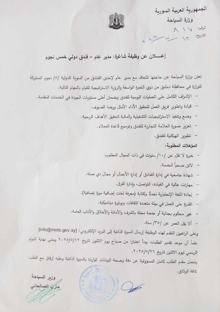 تعلن وزارة السياحة عن حاجتها للتعاقد مع مدير عام لإحدى الفنادق من السوية الدولية / ٥ / نجوم المملوكة للوزارة في محافظة دمشق من ذوي الخبرة الواسعة والرؤية الاستراتيجية للقيام بالمهام التالية: