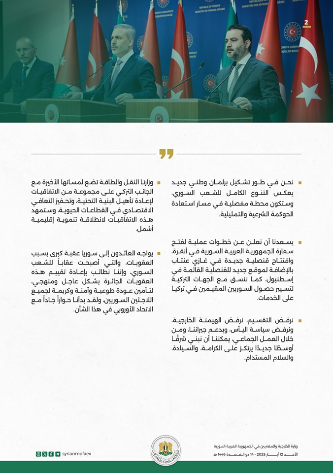 نجدد التزامنا بتعزيز التنسيق العسكري والأمني بين سوريا وتركيا والأردن، الذي أصبحضرورة ملحة لمواجهة التهديدات العابرة للحدود، ورصد الجماعات المسلحة ومنع تسلل المتطرفين إلى أراضينا المشتركة، ولن نسمح باستمرار الميليشيات المدعومة من الخارج أو العناصر الخارجة عن القانون في زعزعة استقرارنا، فوجودهم خطر على أوطاننا.