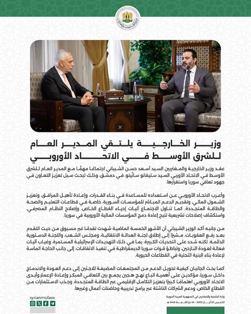 عقد وزير الخارجية والمغتربين السيد أسعد حسن الشيباني اجتماعا مهما مع المدير العام للشرق الأوسط في الاتحاد الأوربي السيد ستيفانو سائينو، في دمشق وذلك لبحث سبل تعزيز التعاون في جهود تعافي سوريا واستقرارها.