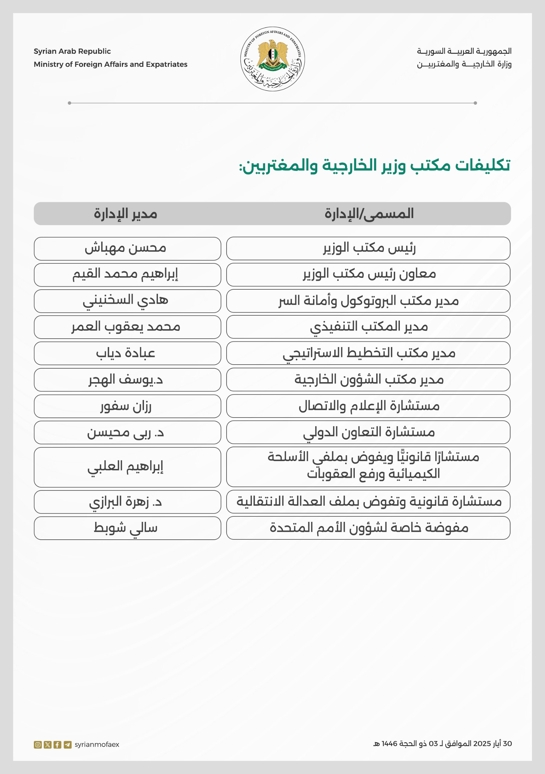 تكليفات مكتب وزير الخارجية والمغتربين السوري