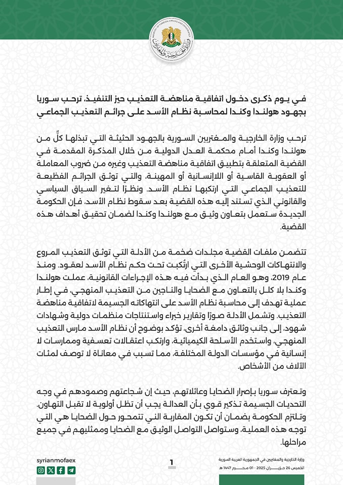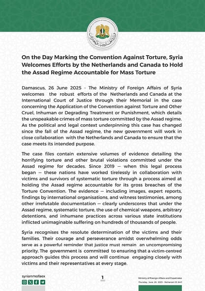 ترحب وزارة الخارجية والمغتربين السورية بالجهود الحثيثة التي تبذلها كل من هولندا وكندا أمام محكمة العدل الدولية من خلال المذكرة المقدمة في القضية المتعلقة بتطبيق اتفاقية مناهضة التعذيب وغيره من ضروب المعاملة أو العقوبة القاسية أو اللاإنسانية أو المهينة، والتي توثق الجرائم الفظيعة للتعذيب الجماعي التي ارتكبها نظام الأسد. ونظرًا لتغير السياق السياسي والقانوني الذي تستند إليه هذه القضية بعد سقوط نظام الأسد، فإن الحكومة الجديدة ستعمل بتعاون وثيق مع هولندا وكندا لضمان تحقيق أهداف هذه القضية.